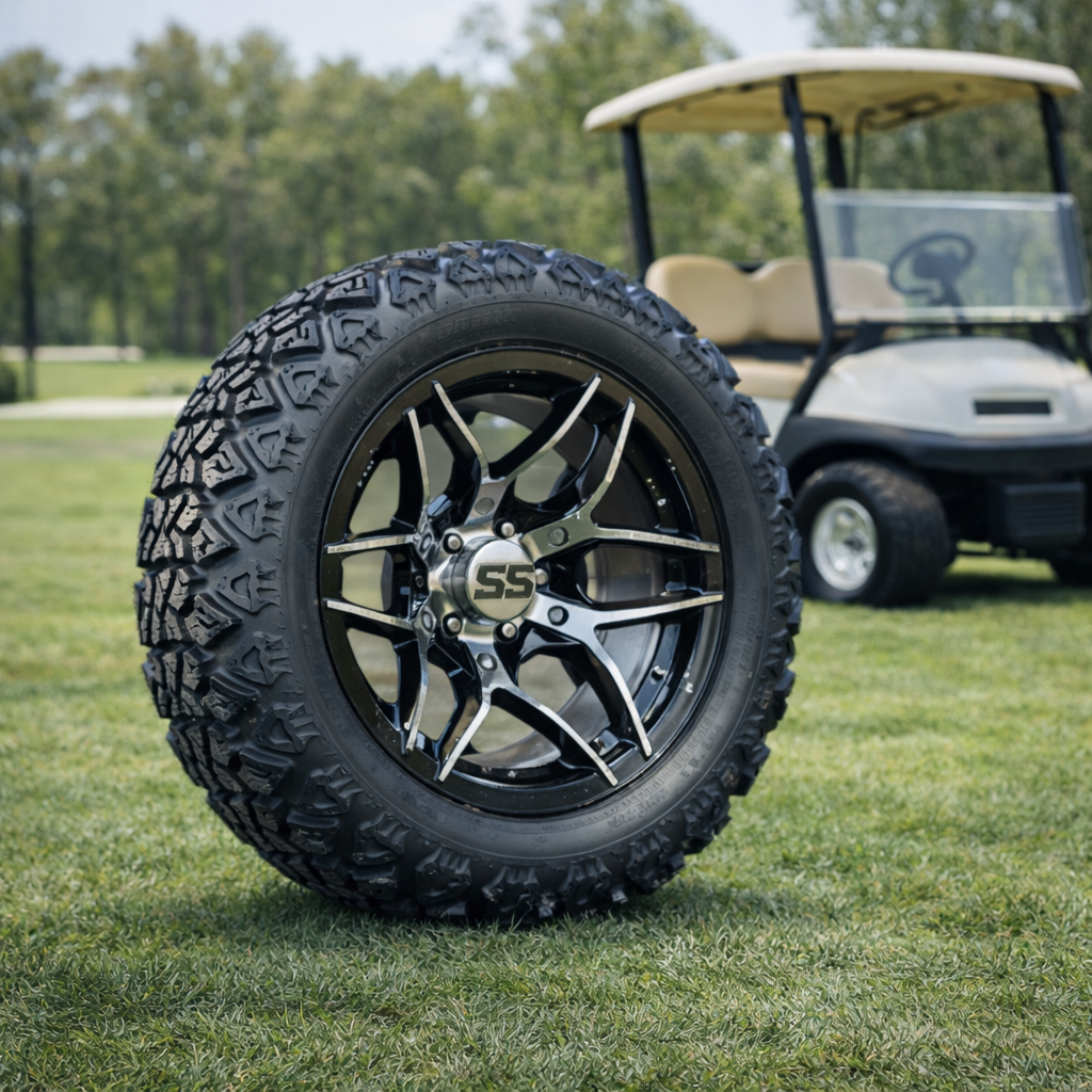 • 🖤 Design : finition souvent noire ou mixte (noir + machiné), look agressif et moderne qui donne un style « off-road » à ton golf cart.