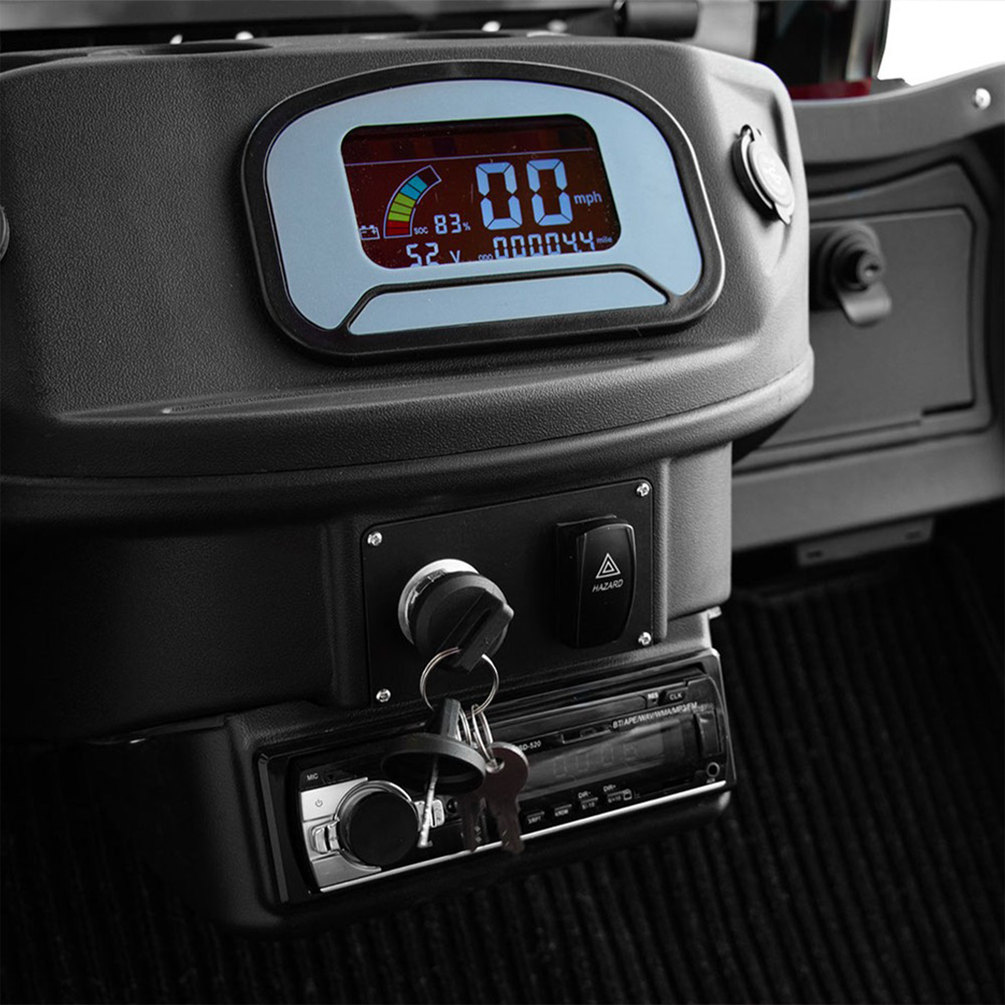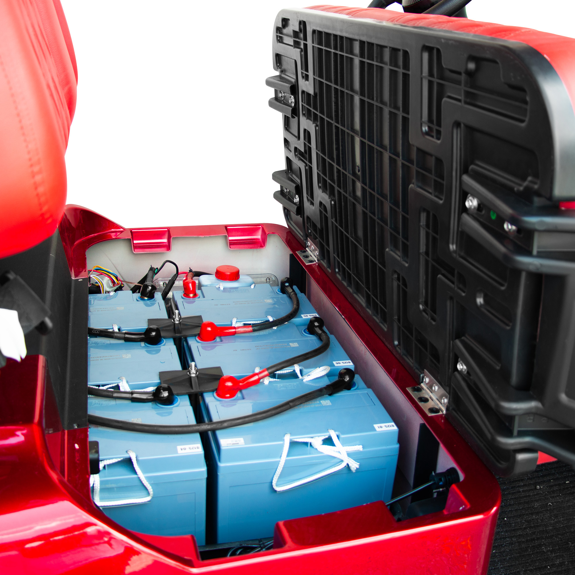Dotée de batteries au gel 48V offrant jusqu’à 300 cycles de recharge, elle vous assure fiabilité et autonomie. Une façon luxueuse, pratique et agréable de vous déplacer sur votre propriété, au camping ou sur le terrain de golf.